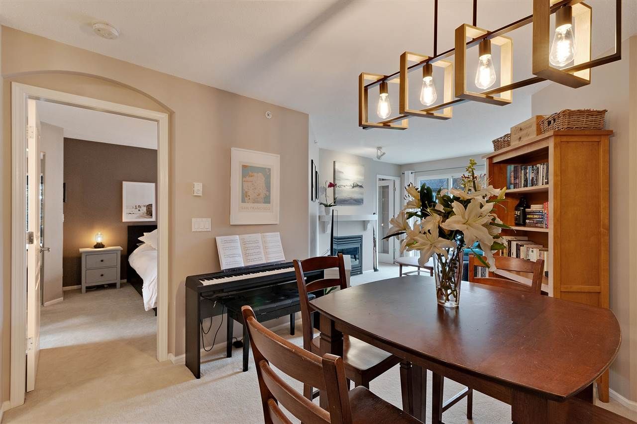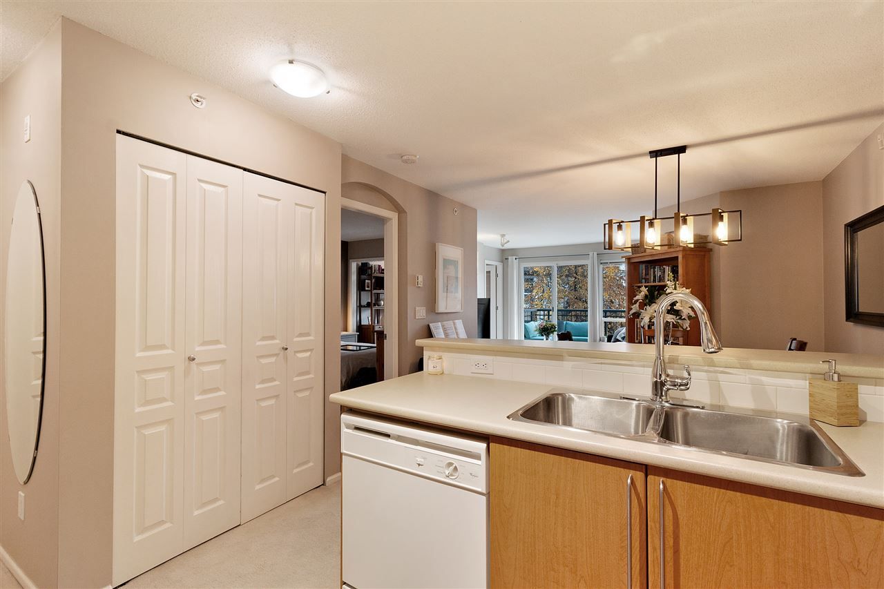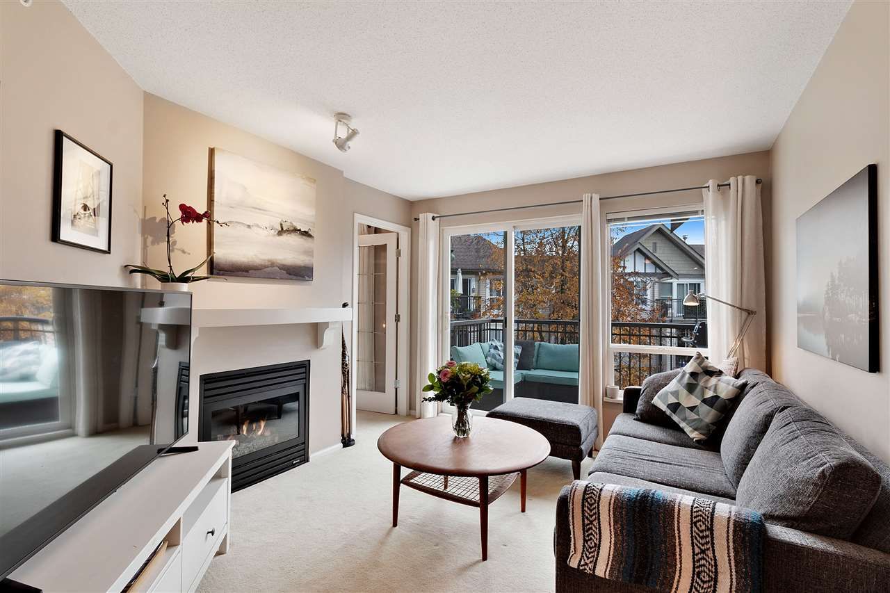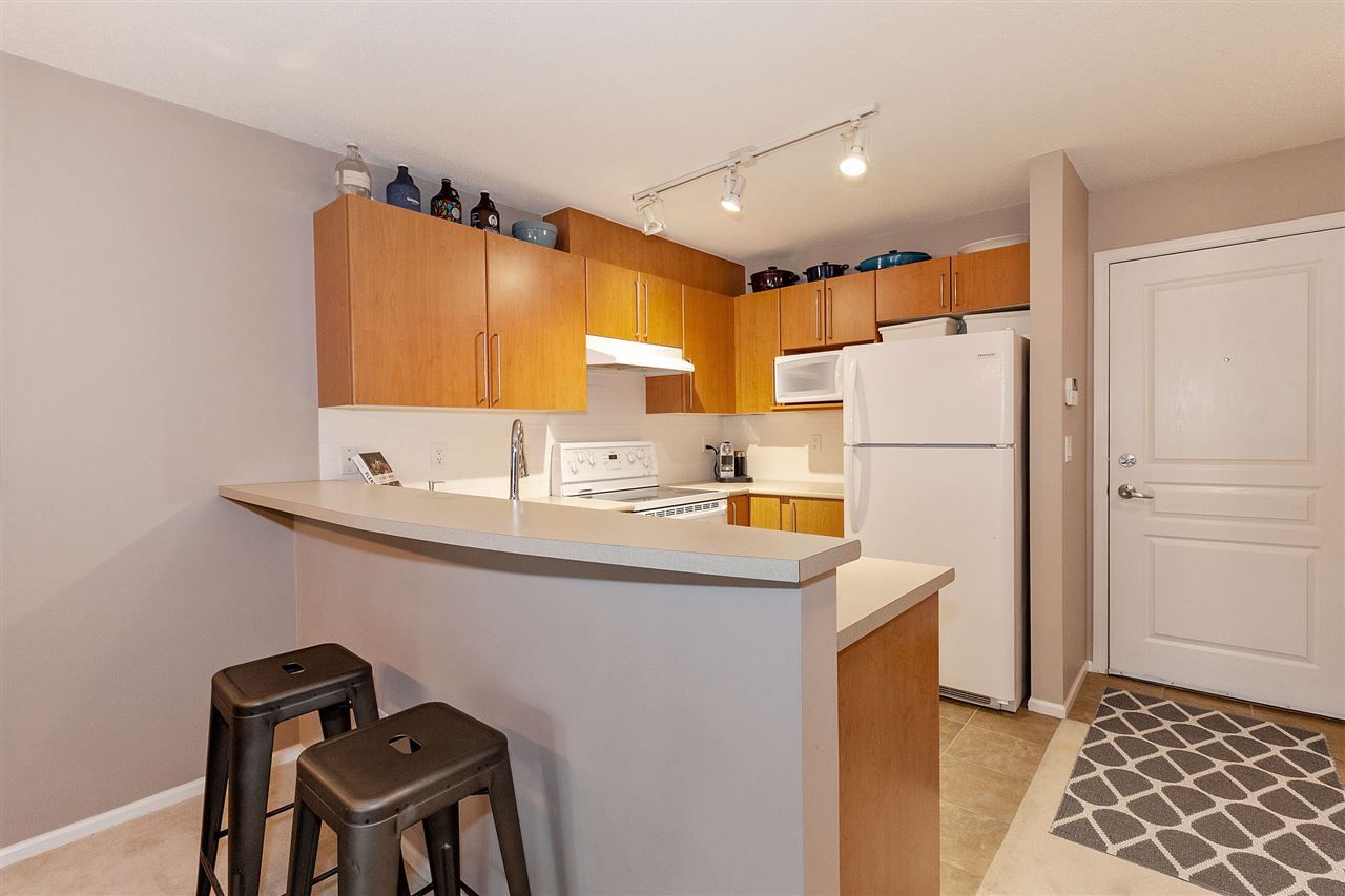 TOP FLOOR! This 1 bedroom + DEN, has a treed outlook and spacious open floorplan. The comfortably elegant environment, with gas fireplace, is a welcoming spot to call home, both inside and out! Enjoy the outdoor deck, where BBQs (gas/elec.) are accepted + it's east exposure is sundrenched in the mornings and cool in the evenings. Meticulously maintained, this home is situated at the end of the hall, which offers a quiet setting, and stairs to the outdoors are just steps away! Highgate is a well respected, proactive strata. The pride of ownership shows in all the common areas. This walkable location has access to shopping, transit, library, recreation and the many neighbourhood parks and trails. Best of all, Pets are Welcome!