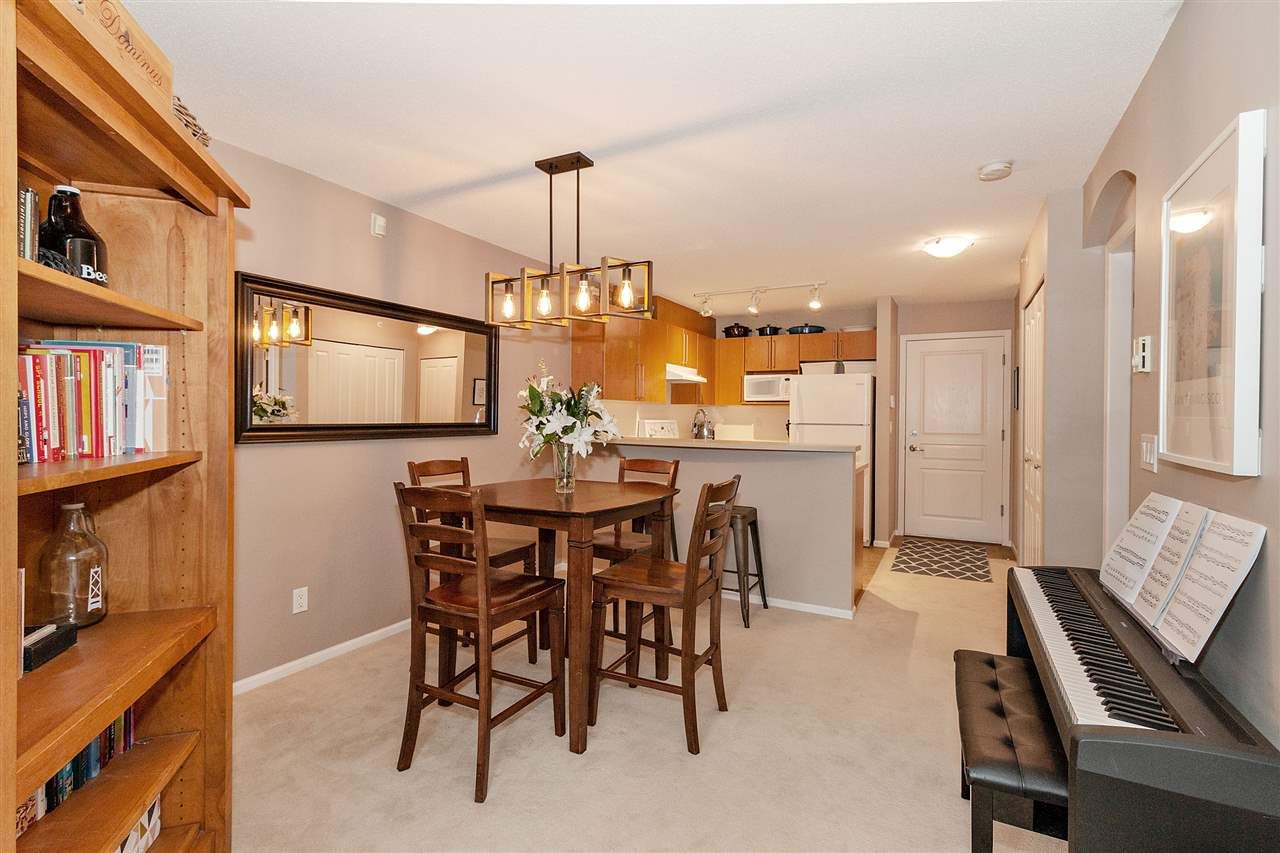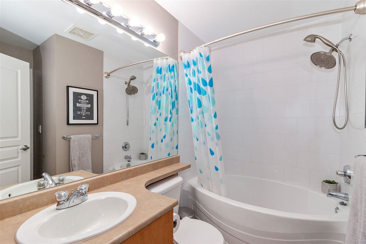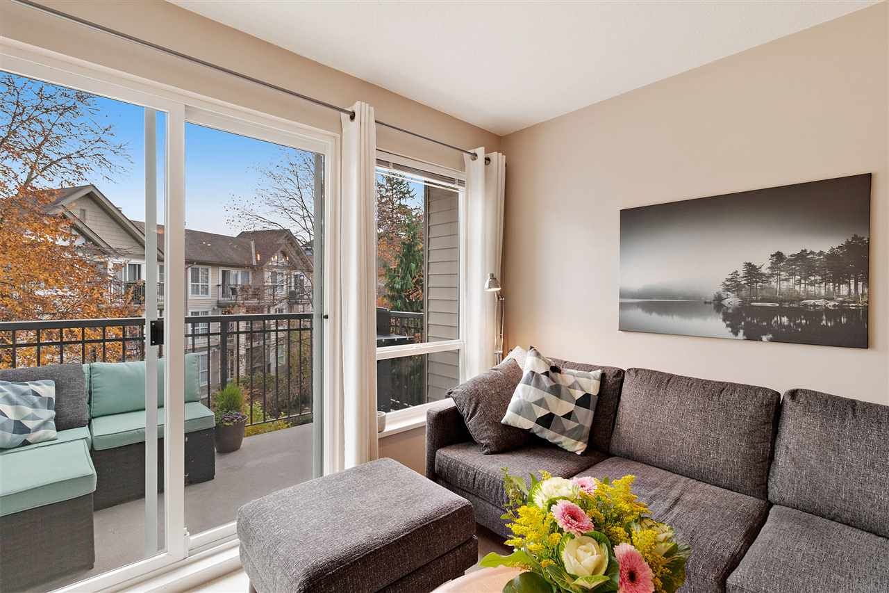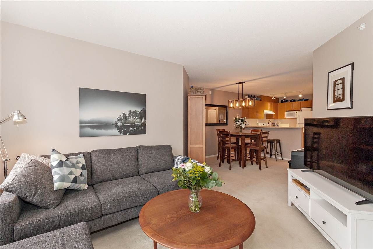 TOP FLOOR! This 1 bedroom + DEN, has a treed outlook and spacious open floorplan. The comfortably elegant environment, with gas fireplace, is a welcoming spot to call home, both inside and out! Enjoy the outdoor deck, where BBQs (gas/elec.) are accepted + it's east exposure is sundrenched in the mornings and cool in the evenings. Meticulously maintained, this home is situated at the end of the hall, which offers a quiet setting, and stairs to the outdoors are just steps away! Highgate is a well respected, proactive strata. The pride of ownership shows in all the common areas. This walkable location has access to shopping, transit, library, recreation and the many neighbourhood parks and trails. Best of all, Pets are Welcome!